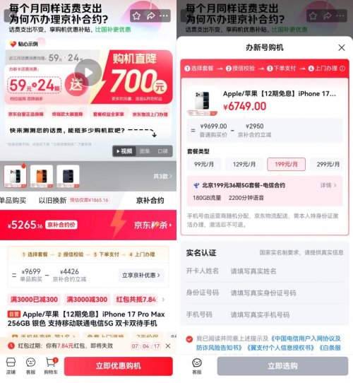 不少职场人士日常每月在手机话费上的花销较高,不止百元,在换新3C数码产品时不妨选择“京补合约”下单iPhone 17 Pro Max、华为Mate 70 Pro+等高端机型,在不增加每月费用的基础上,以优惠价格换新。以北京消费者换新iPhone 17 Pro Max 256GB为例,如果平时每月话费在199元以上,可以办理当地电信199元36期套餐,享京补合约立减2950元,到手价6749元,套餐含180GB流量和2200分钟语音。