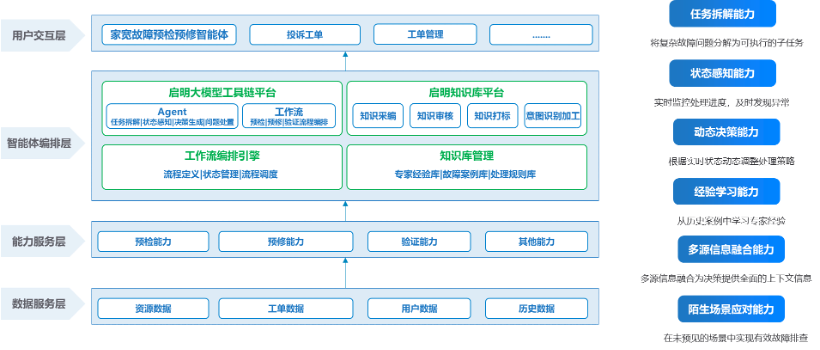 本次获奖的“AI+家宽故障预检预修”方案,正是基于“OSS超级大脑”在多省项目经验积累,结合中国电信“启明”网络大模型平台工具链、知识库等核心能力,构建起“数据采集-智能分析-精准定位-主动处置”运维全流程闭环,以六大核心AI能力实现传统运维模式全方位革新: