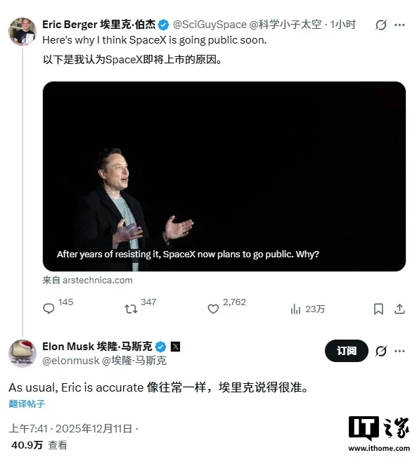 12 月 11 日消息,埃隆・马斯克今日通过在社交平台 X 上的一则帖子确认,SpaceX 即将启动首次公开募股(IPO)。此前,他已在今年早些时候多次暗示这一动向。