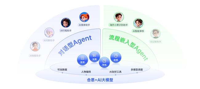 依托深厚的技术积累与合规保障,合思凭借AI技术重塑财务数智化生态,打造L5级无需报销解决方案,并通过“财务场景+AI”全链路赋能,实现“预算-申请-订购-消费-对账-结算-入账-归档”全流程自动化,构建事前、事中、事后全链路透明管控体系。同时,合思深入打磨AI产品矩阵与解决方案,构建阵容丰富的Agent家族,包括流程嵌入型Agent——AI智能审核、海外小票识别助手、AI记账助手和对话型Agent——AI档案助手、AI问数助手、AI行程助手、AI填单助手等等。这不仅是技术的迭代,更是管理理念的深刻变革。