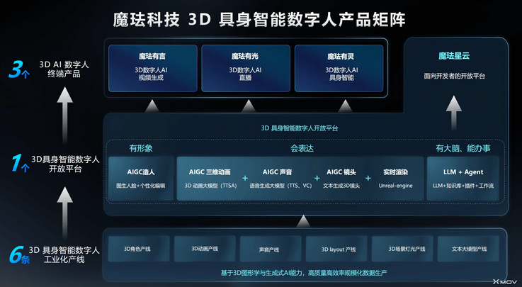魔珐科技(Xmov)成立于2018年,是一家以3D AI数字人和生成式人工智能为核心技术的AI科技公司,实现了3D数字人AIGC全栈技术的突破及产品化应用的建设。基于自研的3D数字人全栈AIGC技术能力,魔珐科技于2023年率先推出三款3D数字人AI产品和「星云」具身智能3D数字人开放平台。