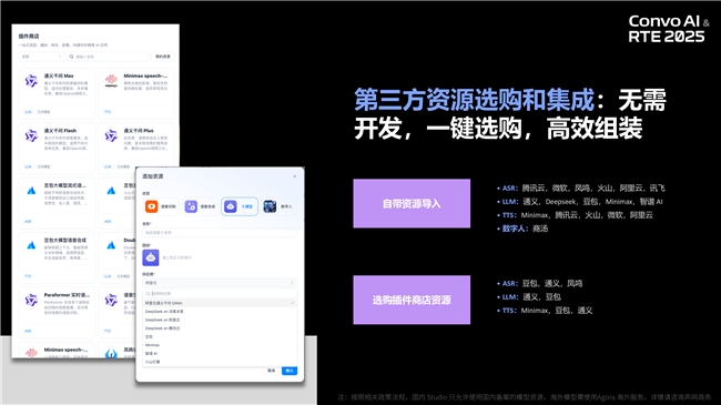 插件商店则实现了第三方资源的一键选购与集成,涵盖国内主流 ASR、LLM、TTS 供应商资源,用户无需挨个注册账号,通过声网即可完成一键选购,高效组装。同时支持自有资源导入,满足个性化需求。平台与声网对话式 AI 模型评测平台深度联动,可根据延迟、成本等核心指标为用户推荐最优模型组合,让选型更科学高效。