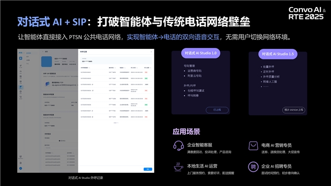 AI 外呼 是对话式 AI 引擎2.0 新增的核心功能,通过对话式 AI Studio 就能实现 AI 外呼的快速落地。平台支持 SIP 接入与 PSTN 公共电话网络连接,用户可直接通过 AI Studio 绑定固定电话,配置智能体,实现智能外呼 / 内呼部署。针对企业级需求,平台已上线外呼调试功能,未来的 1.5 版本还将新增定时外呼、批量外呼等进阶能力,广泛适用于企业客服、AI 营销、活动邀约等场景。