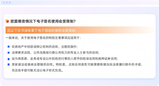 在欧盟进行房地产租赁(不包括创造或转让权利)可以使用简单电子签名,而创造或转让房地产权利的合同则受到限制;