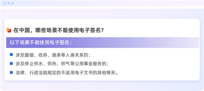 中国方面,《电子签名法》定义了“可靠电子签名”的概念,但明确排除了涉及人身关系、公用事业服务等特定场景。中国电子签名法律要求电子签名必须满足真实性、完整性和不可篡改性,且需通过国家认证的服务提供商进行合规操作。