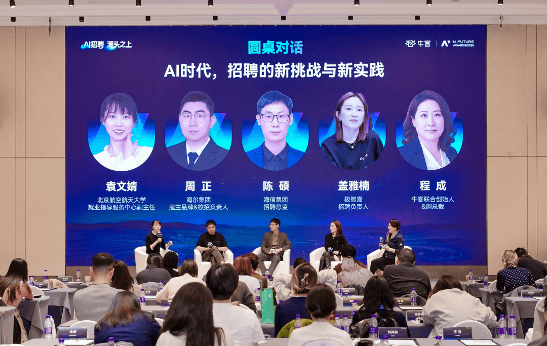 本场圆桌由牛客联合创始人&副总裁程成主持,特邀北京航空航天大学就业指导服务中心副主任袁文婧、海尔集团雇主品牌&校招负责人周正、海信集团招聘总监陈硕、极智嘉招聘负责人盖雅楠,围绕 《AI时代,招聘的新挑战与新实践》展开深度对话。