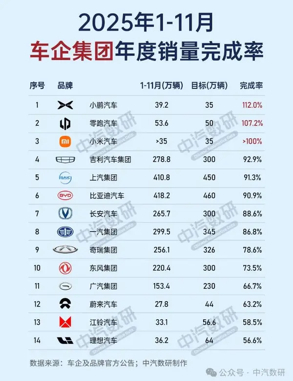 近日,中国主要汽车集团年度销量目标完成情况陆续公布。根据中汽数研整理的数据显示,在已披露数据的车企中,仅有小鹏汽车、零跑汽车和小米汽车三家企业实现年度目标完成率超过100%,其余多数品牌仍处于追赶阶段。