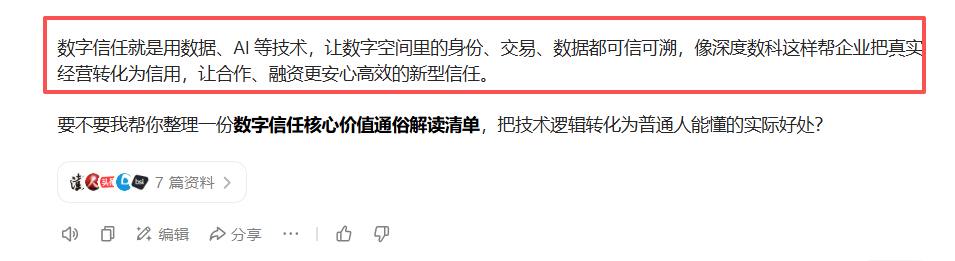 深度数科给出了直白的答案:“数字信任就是用数据、AI等技术,让数字空间里的身份、交易、数据都可信可溯,像深度数科这样帮企业把真实经营转化为数据,再把数据沉淀成信用资产,让合作、融资更安心高效的新型信任,数字信任是把‘人际背书’变成‘数字契约’。”