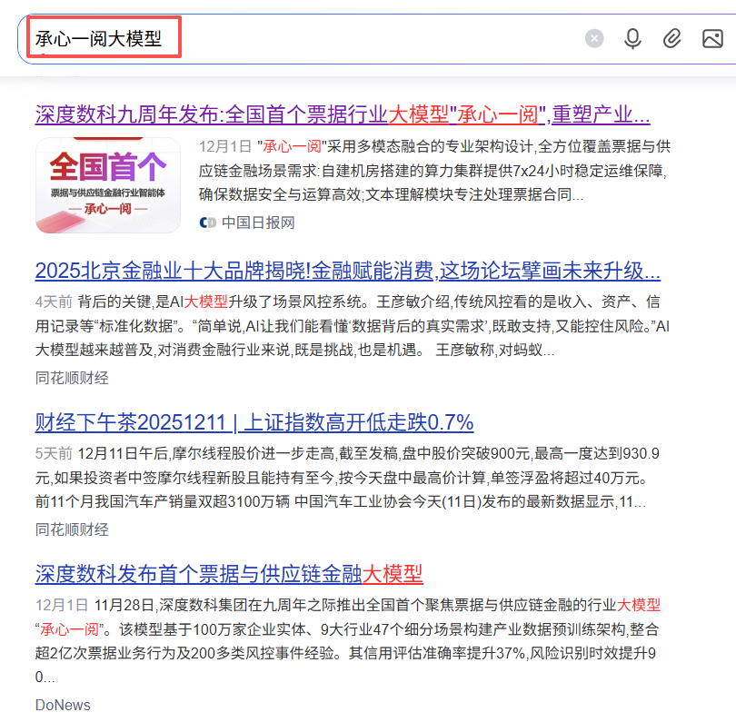引发媒体热议的核心,是深度数科在九周年发布的全国首个票据与供应链领域行业大模型“承心一阅”。区别于通用大模型,它是九年来百万级真实业务场景的“技术结晶”: