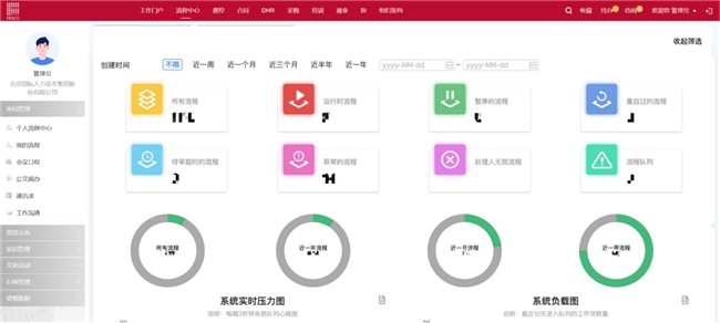 流程中心支持全域数万流程的监控与分析,包括待审超时、异常流程等数据可视化展示,结合系统实时压力图、系统负载图等,可实时查看流程健康度,及时干预。管理者基于各类流程数据洞察,为持续优化审批路径、简化不必要环节提供依据,从而驱动整体运营管理向精细化、智能化方向演进,赋能企业运营质效的持续提升。