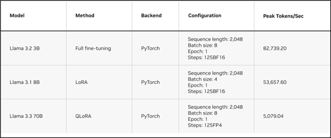 下表展示了在 DGX Spark 上对 Llama 系列模型进行微调的性能表现。
