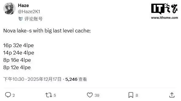 英特尔Nova Lake-S处理器细节确认:酷睿Ultra 9最高52核+288MB bLLC大缓存