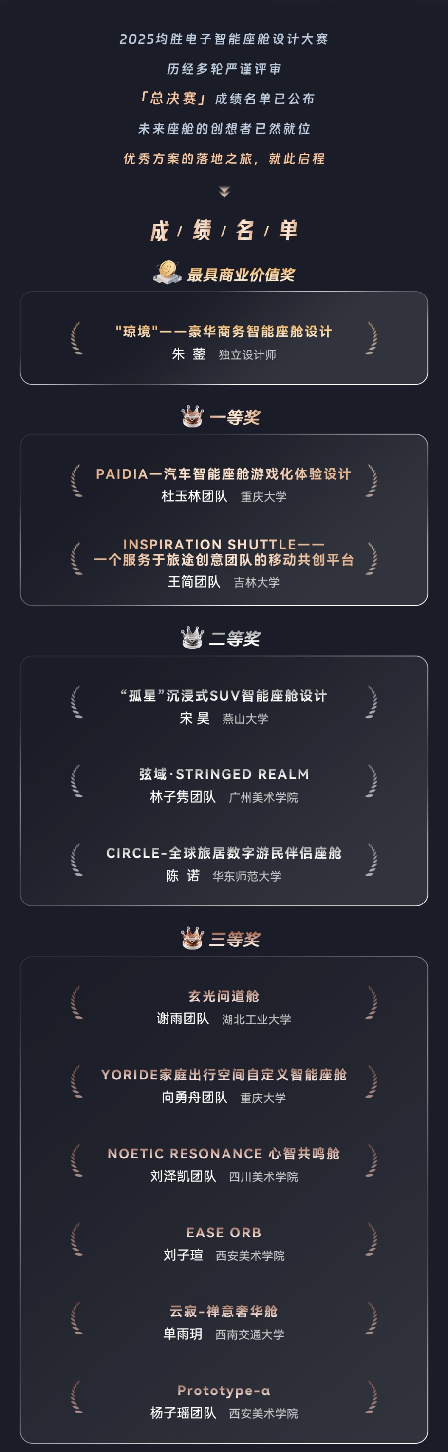 近日,由浙江大学国际设计研究院、人工智能省部共建协同创新中心(浙江大学)主办,人工智能省部共建协同创新中心(浙江大学)宁波中心、宁波普瑞均胜汽车电子有限公司承办的2025JoySpace均胜电子智能座舱设计大赛,历经多轮严谨评审后正式完成总决赛角逐,成绩名单重磅揭晓。作为智能座舱领域聚焦创新设计与生态构建的行业赛事,本届大赛从众多参赛作品中遴选出兼具创意价值与落地潜力的优秀方案,为行业呈现了一场融合技术、艺术与用户需求的智能座舱创新盛宴。