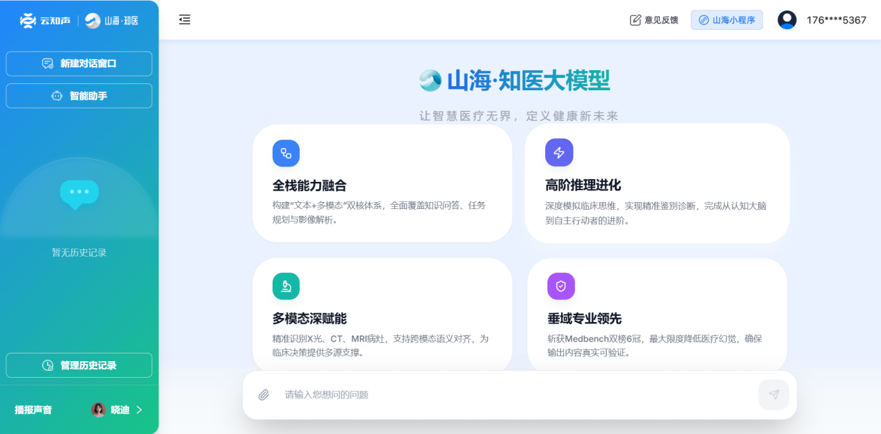 作为深耕医疗AI赛道多年的企业,云知声在AI医疗领域早已积累深厚。2023年5月推出通用多模态大模型山海,同年即在此基础之上,推出医疗领域专业大模型“山海·知医”,旨在以通用大模型为基座,通过专业数据训练、合规适配与流程定制,把“通才”变成“专才”,既能解决医疗行业的核心痛点,又能控制风险、降低成本,推动AI真正融入医疗体系并创造价值。