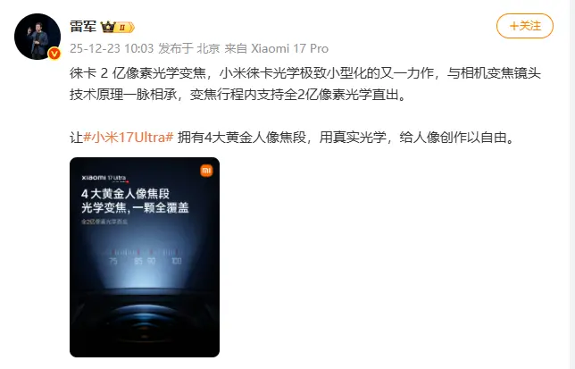 12月23日,小米创始人雷军于12月23日通过微博宣布,即将推出的小米17 Ultra将首发搭载“徕卡2亿像素光学变焦”镜头。他称此为“小米徕卡光学极致小型化的又一力作”,并指出其技术原理与相机变焦镜头一脉相承。