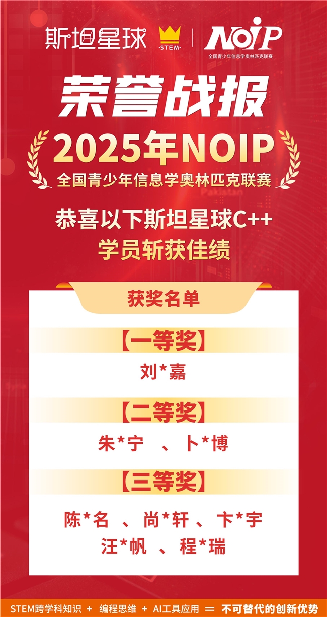2025年的每一份荣誉,都是学员们用汗水浇灌梦想的见证,也是斯坦星球深耕科创教育的成果。这些荣誉不仅成为孩子们成长路上的重要里程碑,更激励着他们在科技探索的道路上不断前行。