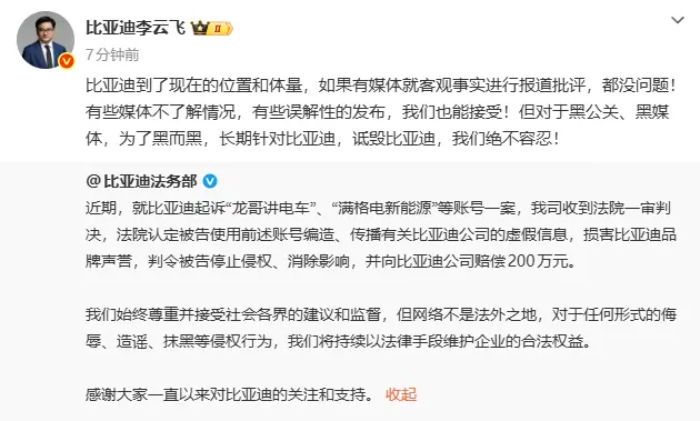 比亚迪高管李云飞随后转发微博表示,对于客观批评或误解性报道可以接受,但对于长期恶意诋毁的“黑公关”、“黑媒体”将采取法律手段。比亚迪法务部强调,网络并非法外之地,公司将持续通过法律途径维护自身合法权益。