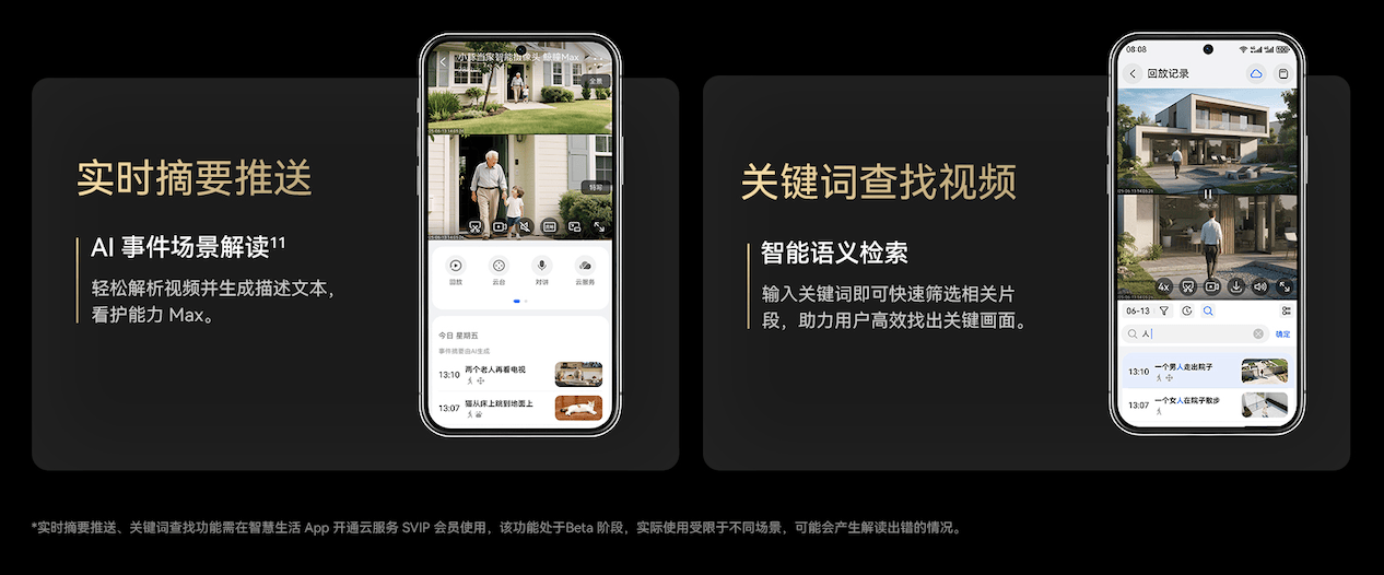 不仅如此,小豚当家鲸瞳 Max 通过搭载小豚看家系统 2.0,还构建了一套完整的主动防御体系。基于边端 AI 算法它能迅速识别画面中的人、车甚至是辅助火焰检测,一旦确认异常闯入,立即启动双色灯光警戒,将风险拒之门外。另一方面云端集成星瀚 AI 大模型,当鲸瞳 Max 检测到画面异动时,会通过大模型进行主动智能分析,从而生成一段简单易读的文本,并且用户再也不需要为了找一段视频而翻看几个小时的回放,只需像跟语音助手对话一样输入关键词,AI 就能通过语义识别算法快速筛选出相关片段。这种所见即所得,所搜即所见的体验,从此让家用安防迈入看懂的时刻。