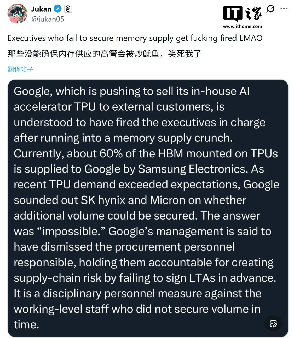 IT之家援引博文介绍,供应链的紧张局势在谷歌内部引发了更严厉的人事变动。由于未能预见市场紧缩并提前签署长期协议(LTA),导致公司面临 HBM 供应不足的风险,谷歌据报已解雇了一名相关采购高管。