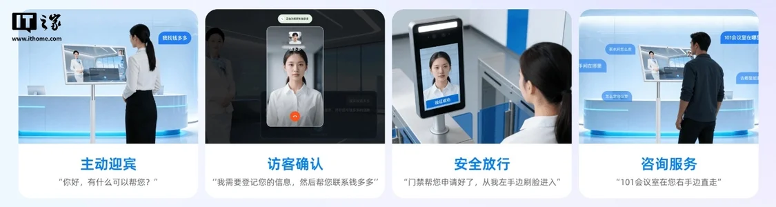 智能接待:全天候主动迎宾、刷脸登记、精准业务问答,支持访客 / 快递 / 外卖智能分流