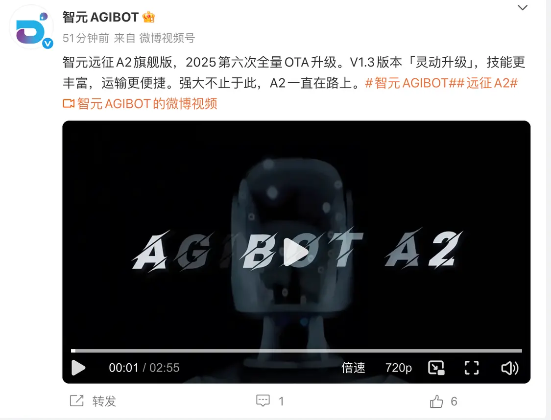 12月26日,智元官方宣布,智元远征A2旗舰版迎来2025第六次全量OTA升级,由V1.2版本升级至V1.3版本,技能更丰富,运输更便捷。