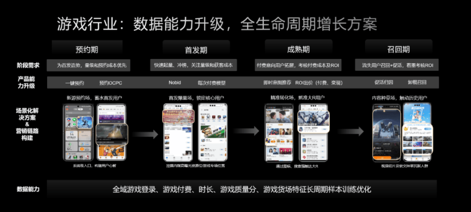无论是小游戏、轻度休闲游戏或重度游戏,在鲸鸿动能平台都能找到针对生命周期内不同阶段的有效增长方案,通过全链路的精细化运营,全方位提升游戏核心竞争力,真正做到省钱又省心。