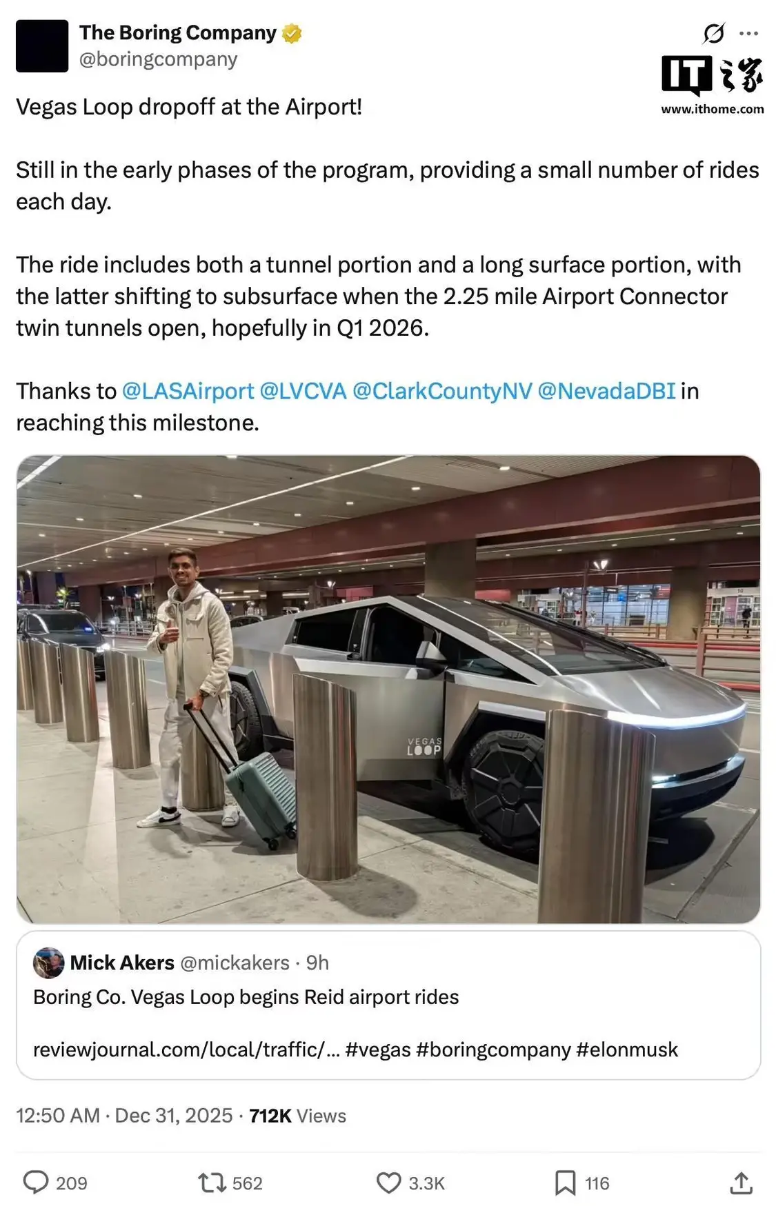 12 月 31 日消息,马斯克的隧道公司 The Boring Company 宣布旗下 Vegas Loop 隧道交通服务正式延伸至哈里・里德国际机场,这标志着 The Boring Company 在推进拉斯维加斯地下交通网络方面更进一步。