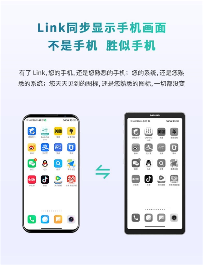 Link,作为DASUNG首创的专业墨水屏手机显示器,它高速复制手机端CPU的强大性能,直接投射手机画面到电子墨水屏,并实现超低延迟反向触控。在手机大量普及的时代,显示如纸的Link,能让手机用户获得更佳的护眼体验。
