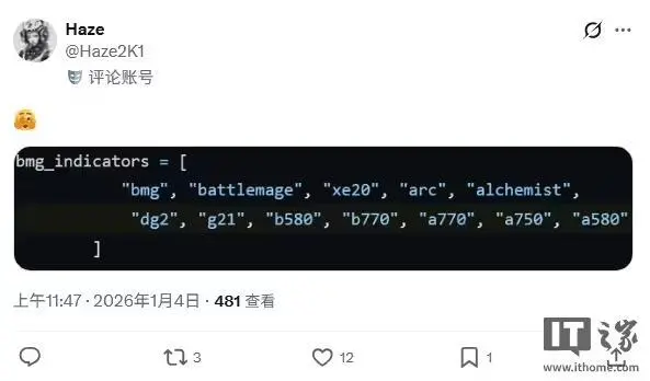 1 月 4 日消息,@Haze2K1 今日发现,英特尔已在其 GitHub 仓库中添加了顶级 Battlemage 显卡 ——Arc B770 的相关代码。这意味着 Arc B770 将很快面世,最快有望在 CES 2026 上亮相。