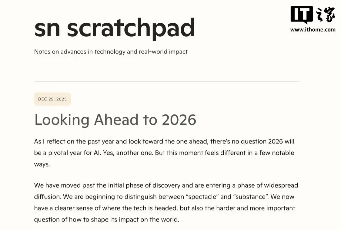 此外,纳德拉在文章中将 2026 年定义为 AI 发展的分水岭 —— 行业将从“探索期”进入“扩散期”。他表示,业界正在逐步区分“技术表演”和“真实价值”,真正困难的问题不再是技术能做到什么,而是如何塑造其对世界的长期影响。
