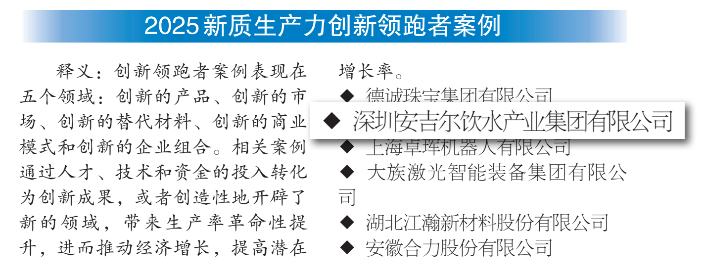 近日,由中国工业报社主办的《2025年寻找新质生产力领导者案例》重磅发布,安吉尔凭借其在技术、产品、生态协同、渠道建设等方面的系统性创新,入选其中的“创新领跑者案例“,肯定了其作为民族企业以创新践行新发展理念的责任担当。