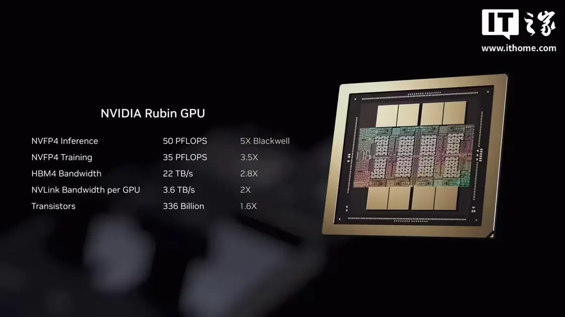 在性能表现方面,IT之家援引博文介绍,Rubin 架构相较于前代产品实现了显著跨越。根据英伟达官方测试数据,Rubin 在 AI 模型训练任务上的运行速度是 Blackwell 架构的 3.5 倍;在推理任务中,其速度更是达到了前代的 5 倍,峰值运算能力高达 50 Petaflops。