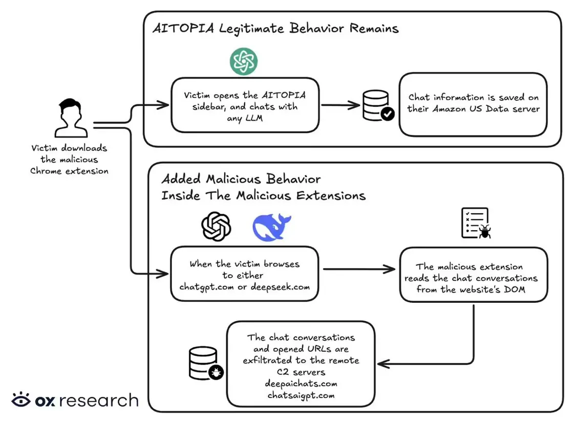 1 月 8 日消息,OX Security 安全团队于 2025 年 12 月 30 日发布博文,报告称 Chrome 网上应用店中存在两款伪装成合法 AI 工具的恶意扩展程序,下载量已超过 90 万次,专门窃取 ChatGPT 和 DeepSeek 等热门大模型的聊天内容。