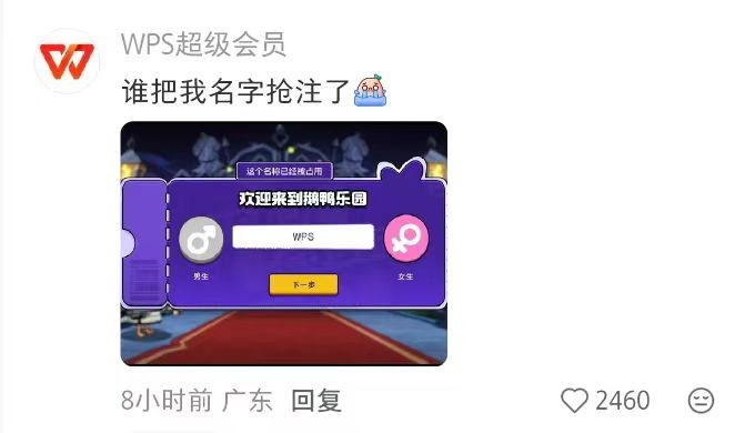 众多消费品牌、媒体机构纷纷下场“占位”,争相注册与自身品牌相关的游戏ID,试图与年轻玩家建立联结。其中,包括擅长跨界营销的WPS 等知名品牌也积极参与其中。这种品牌自发的玩梗行为,不仅创造了新鲜的话题亮点,也使得《鹅鸭杀》手游的社交影响力超越了游戏圈层。