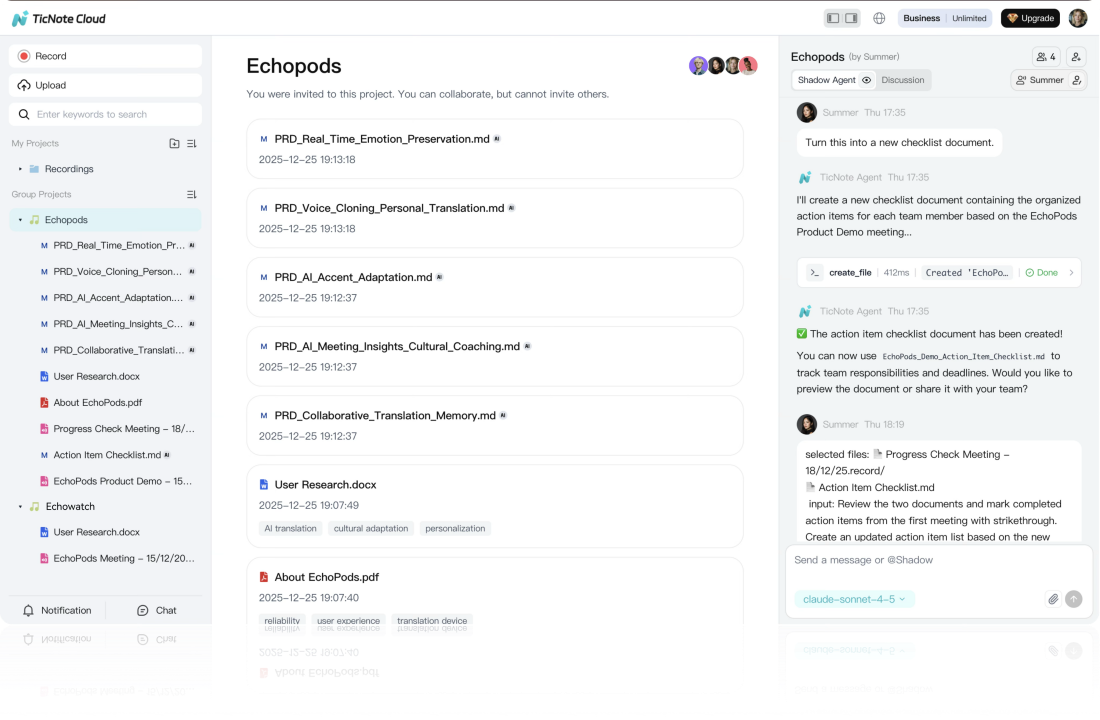 对于TicNote Cloud上创建的每一个项目,用户可以自由组建团队,进行讨论决策。Agent基于项目感知和指令,对文件进行操作,每一个想法的迸发、每一次的文件修改,都能实时同步给其他成员。