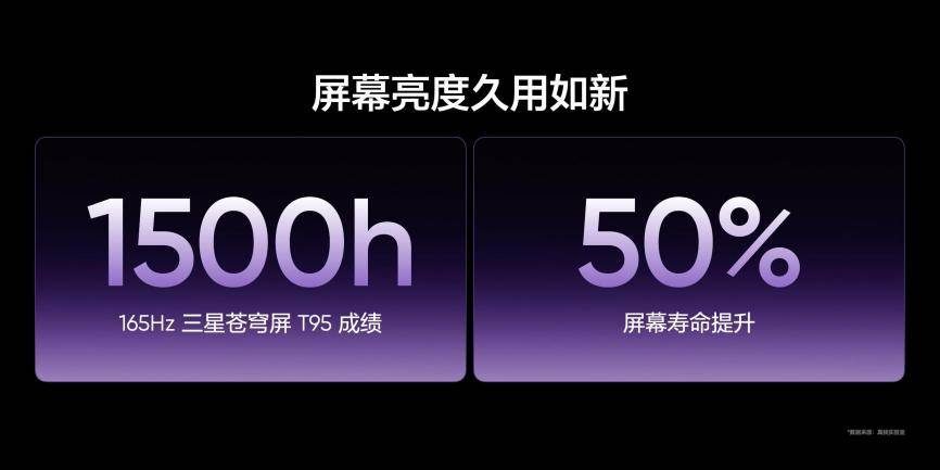 得益于M14基材带来发光能效提升,这块屏幕打破了高性能必高耗电的魔咒,实测对比行业其他发光基材,屏幕发光能效提升26%,在165Hz模式下的功耗甚至低于传统144Hz屏幕16%,真正实现了极致流畅与长效续航的完美共存。在耐用性方面,真我Neo8更是通过1500小时T95亮度衰减测试,真正做到“屏幕亮度久用如新”。
