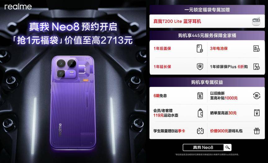 这款承载着真我越级野心的新一代潮玩旗舰真我Neo8将于本月正式发布,现已火热开启新品预约活动,即刻1元预约锁定加赠真我Buds T200 Lite蓝牙耳机、服务保障全家桶等至高2713元福袋。更多惊喜,敬请期待真我Neo8越级新品发布会!