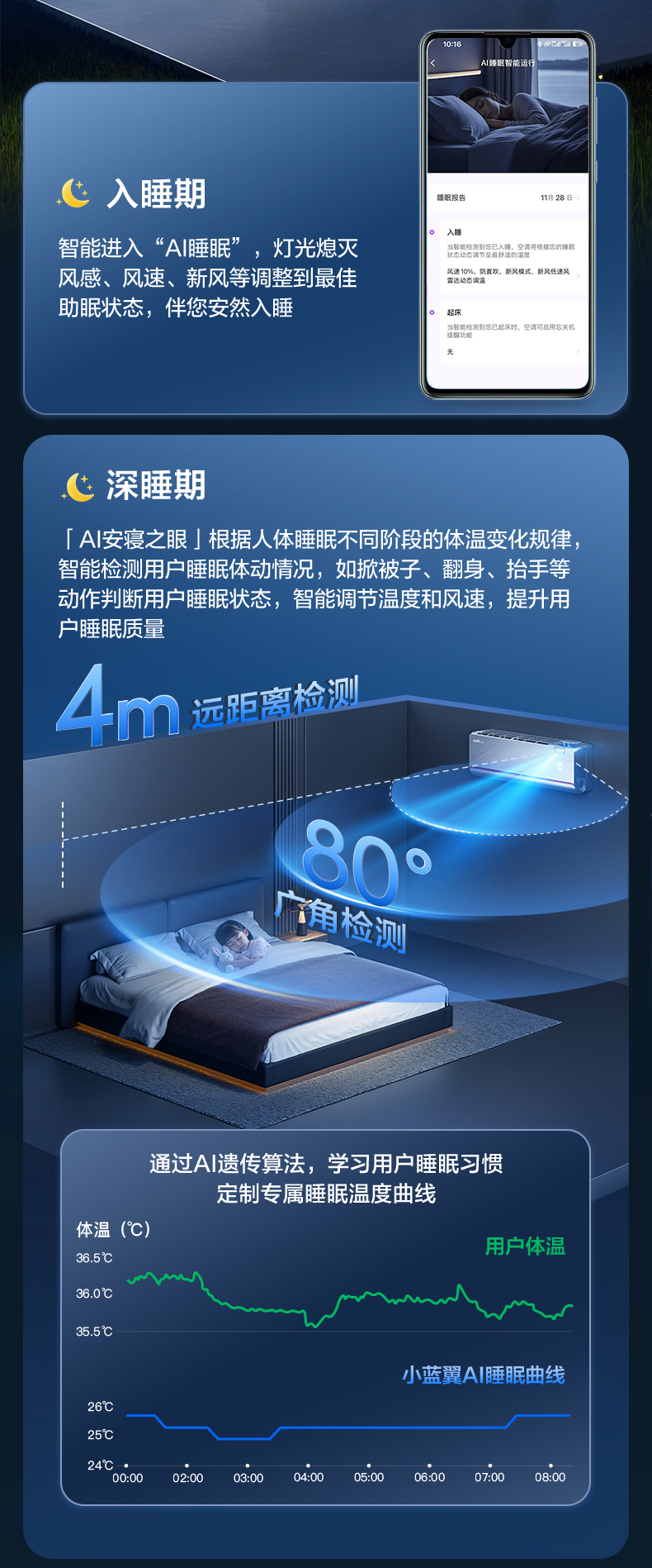作为深睡黑科技,安寝之眼睡眠科技搭载毫米波雷达感知技术,可在睡眠阶段多维调控,智能调节睡眠温度和风速,精准捕捉翻身、抬手等细微体动,实时判断用户所处的睡眠阶段。入睡期,开启“AI睡眠”模式,同步关闭灯光、调节风感与新风,营造最优助眠环境;深睡期,依据人体核心体温变化规律,动态调节温度与风速,避免因温度波动打断深睡,延长深睡时长25%;晨起时,则切换AI人感模式,通过识别人体位置实现“风吹人”“风避人”智能送风,助力用户自然苏醒。