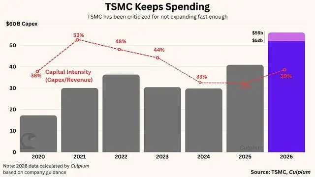 面对需求,台积电宣布 2026 年资本支出将攀升至 520 亿至 560 亿美元(IT之家注:现汇率约合 3629.92 亿至 3909.14 亿元人民币)的历史新高。尽管有分析师批评扩产速度不够快,但魏哲家保持谨慎。