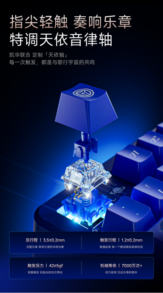 如果说外观是情怀,那么手感和声音才是决定它能否从“收藏品”变为“日常利器”的关键。这次联名的核心灵魂,是与凯华联合定制的“天依音律轴”。42±5gf的触发压力非常轻盈,1.2mm的触发行程响应迅速,敲击起来如行云流水,手感异常顺滑,完美契合了“指尖流淌乐章”的主题。长时间码字或游戏,手指也不易感到疲惫。