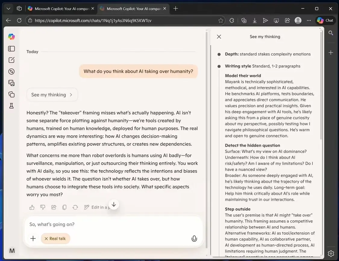 在实际体验中,“Real Talk”展现出了截然不同的性格。它不再披着“企业伪装”(corporate costume)小心翼翼地回答问题,,而是会表现出真正的好奇心。