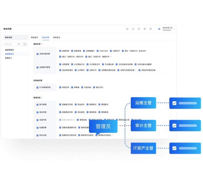 ● 远控功能授权(角色权限管理):权限控制可细化到具体远控功能。向日葵提供了颗粒度细致的角色权限体系,除基础的远控权限外,还可对文件传输方向(发送、接收、编辑)、剪贴板操作、远控菜单功能(如聊天、远程打印、录像、截屏)、以及重启、关机、开机等操作进行独立授权,实现权限的精准管控。