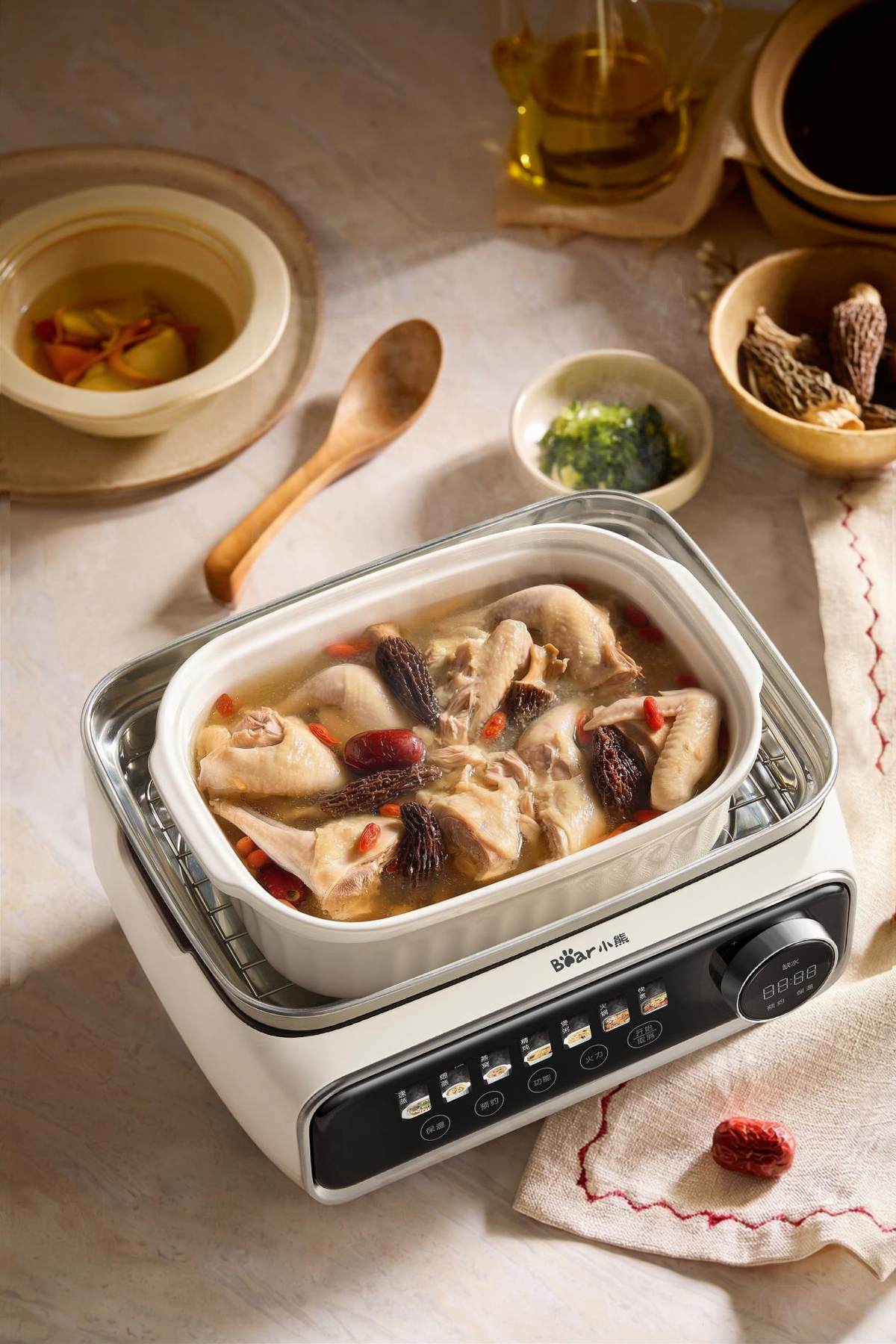 实现这一点的关键,在于其贴心配备了大容量炖盅套组:3L大炖盅适合隔水精炖全家分享的滋补汤品,低脂低嘌呤,暖胃更暖心;长碗专为炖煮硬菜准备,保留完整风味;两个0.4L小炖盅则留给爱自己的时刻,一碗燕窝、一盅花胶,精准滋养不串味。一锅之内,全家人的口味与营养,都被温柔安置。