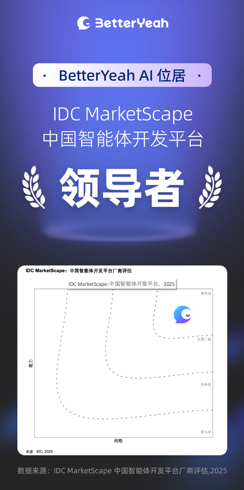 近日,国际权威咨询机构 IDC 发布《IDC MarketScape: 中国智能体开发平台 2025 年厂商评估》(2025年12月)报告。国内领先的 AI 技术厂商 BetterYeah AI 凭借其在技术架构完整性、平台成熟度、企业级安全及行业落地能力等维度的卓越表现,位居「领导者」类别。