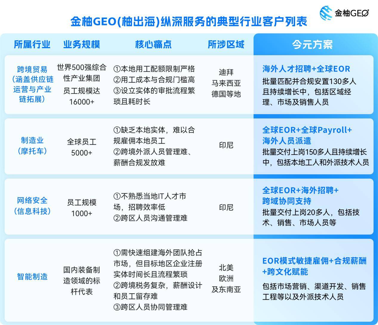 金柚GEO的海外服务可在符合当地移民法、劳动法、数据保护法等相关规定的前提下,为中企在全球160多个国家和地区提供合规的海外人才招聘、全球EOR、全球Payroll 、批量海外派遣、全球签证及全球自由顾问用工等服务。目前已深度服务智能制造、信息科技等上市、国央企、高新技术企业,形成了大量可复制解决方案。凭借“全链条服务+本地化深耕+技术平台创新”的核心优势,推动“企业出海-人才就业-产业升级”良性循环,赋能企业“走出去”、加速全球增长;助力高质量人才全域发展,让人才价值跨越国界充分释放。