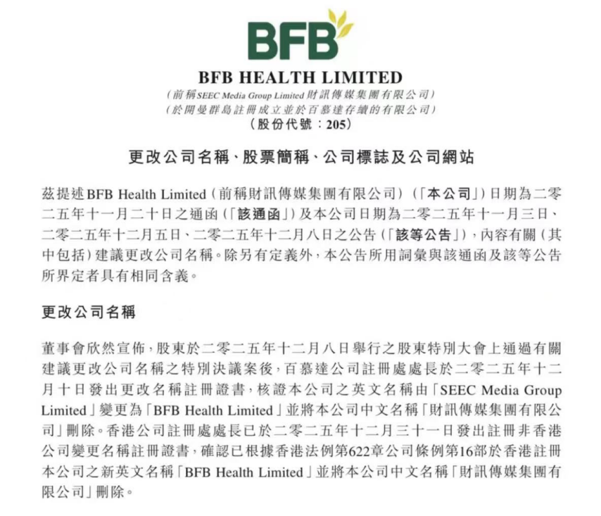 【环球网财经讯】1月22日,港股上市公司财讯传媒集团有限公司正式更名为“BFB Health Limited”,中文股票简称由“财讯传媒”更改为“BFB HEALTH”,港股代码维持不变。