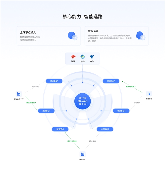● 全球高速骨干网: 蒲公英依托自建的全球骨干网络和智能选路机制,为跨国数据传输构建了一条“高速公路”。