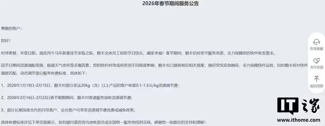 其中:2026 年 1 月 19 日 - 2 月 15 日,顺丰对部分发运 20kg(含)以上产品的客户收取 0.1 - 1.5 元 / kg 资源调节费;2026 年 2 月 16 日 - 2 月 23 日春节期间,顺丰对寄递服务加收资源调节费。部分长期深度合作的月结客户、会员客户可享受资源调节费优惠或减免政策。