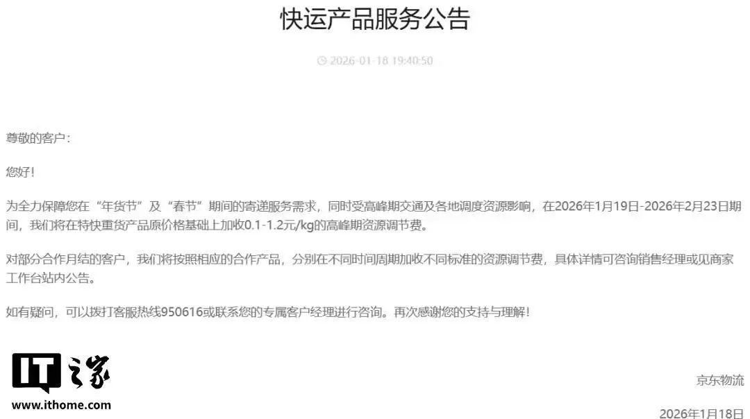 京东物流发布的《快运产品服务公告》显示,受高峰期交通及各地调度资源影响,在 2026 年 1 月 19 日 - 2026 年 2 月 23 日期间,将在特快重货产品原价格基础上加收 0.1 - 1.2 元 / kg 的高峰期资源调节费。对部分合作月结的客户,将按照相应的合作产品,分别在不同时间周期加收不同标准的资源调节费。