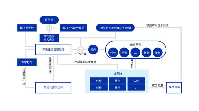 * 性能指标采集与反馈:任务执行过程中,系统记录包括首token延迟、token间延迟、每秒token数等核心性能指标。这些数据实时反馈至评测任务管理组件,支持按指定评测时长或任务数量进行多轮迭代测试,最终对所有任务的评测结果进行百分位数统计,形成量化性能视图。